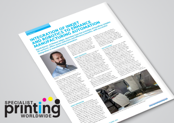 The powerful combination of inkjet and robotics can transform traditional, labour-intensive processes. As an example, the elimination of complex masking requirements to prevent overspray when painting compound curves and other complex geometries encountered in automotive manufacturing has resulted in significant operational efficiency and waste reduction. In addition to the benefits offered by the replacement of traditional processes, inkjet automation has opened the door to new, non-graphical applications where the positional capability of the robotics, combined with the precision and reliability of inkjet can serve the demanding requirements of functional fluid deposition for UV protection, conductive traces, barrier layers and adhesives.